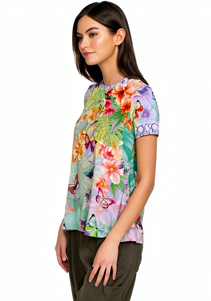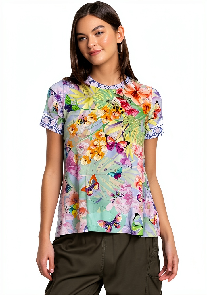 The Cozumel Favorite Short Sleeve Crew Neck Swing Tee from Bag Lady Collection is designed to evoke a magical, nature-inspired mood. Crafted from a blend of rayon and spandex, this tee offers exceptional comfort and stretch, ensuring a flattering swing fit that moves with you. It features a round neckline, short sleeves, and a dreamlike pattern of florals and butterflies, making it a standout piece in any wardrobe. Available in sizes Medium, X-Large, and XX-Large, with a multi-color design that complements various styles. First available in January 2023, this item has garnered positive customer reviews for its quality and appeal.